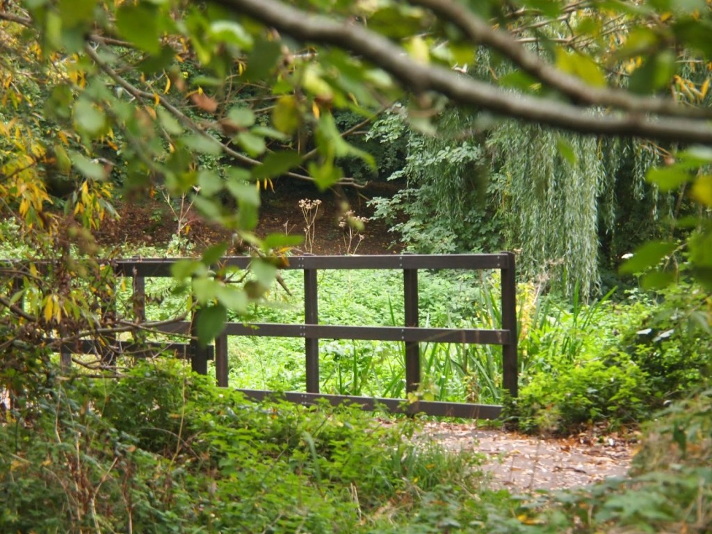 with a concealed stream on the right and some allotments on your left.
