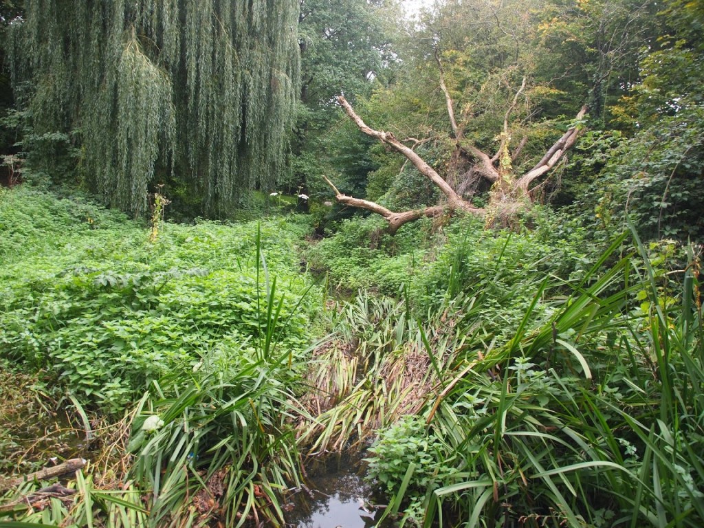 Follow the path past a silted up pond and continue upstream.