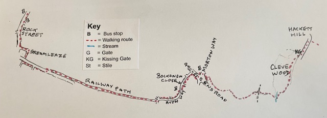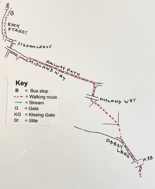 At the end of the Railway Path cross Midland Way and then Cooper Road into the lower path next to the essilor factory. Turn right to the old railway tunnel under Midland Way. On the other side, turn left up Streamleaze then right along Rock Street to return to the bus stops.