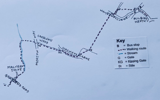 Turn left to Whitewall Lane, then turn right to find steps up to the field on your left. The path heads straight across the field for about half a kilometre to a gate. Bear right down the track to a stile onto the Hackett. Turn right and follow the road down to the corner, where there is a kissing gate into a field. Follow the right hand hedge down to a yellow path and follow it down the side of Crossways Wood to Morton Way (unless it is the bluebell season, in which case you will want to make your way through the wood.)