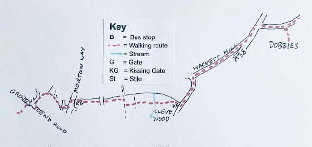 Head down the hill to a ford over a little stream. Head up the hill on the other side to gap/kissing gate into the Cleve Wood estate. Follow the right hand hedge across an estate road and out onto Morton Way.
