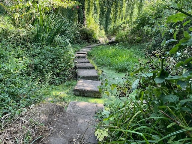 When the tarmac path crosses the stream, you have the option of using the muddier path on the other bank, which leads to some stepping stones, which are slippery when wet.