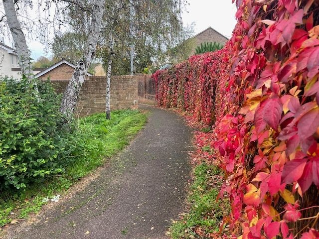 Go straight ahead across the field or take the path around the right hand edge of the field. In either case, descend to the Streamside Path and go up the Ginnel into Maple Avenue. Go straight ahead to another Ginnel to a small Green and keep right.
