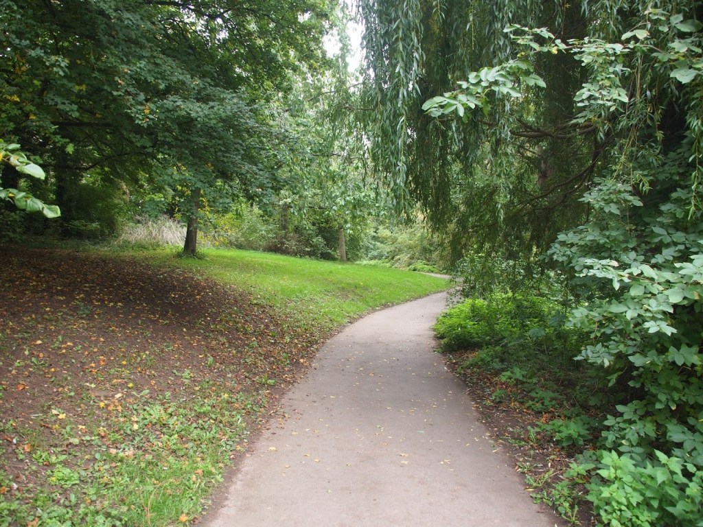 Go through the underbridge beneath Park Road and follow the path past the Scout Hut. Continue to follow the path past the remains of the old sewage works to Gloucester Road.