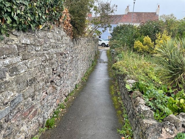 The Ginnel turns into an enclosed path past the playing field of Christ the King Primary School, which goes to the top of Easton Hill Road.